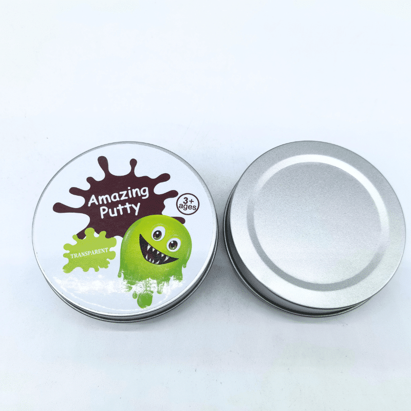 The 60g Glass Putty Toy comes in a round tin can(8*3cm).